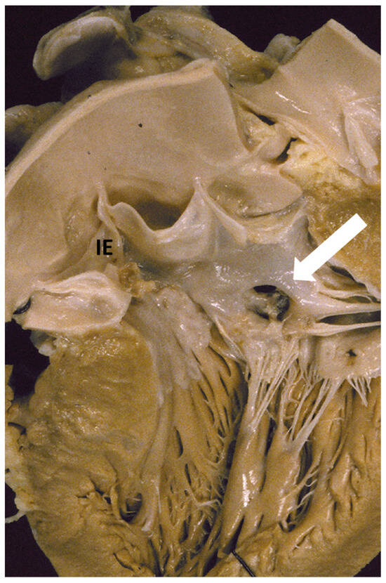 The fibrous plaque growing over the left-sided endocardium of the asymmetric septal hypertrophy may be a substrate facilitating infective endocarditis onset in case of bacteremia. Transfer of the infection may occur from the septum to the anterior mitral leaflet (“kissing lesion”) and the aortic cusps, with the onset of vegetations, cusp perforation, and aneurysm (Figure 16).