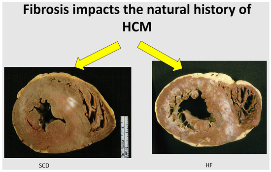 Septal reduction therapies, i.e., surgical myectomy (classical or “modified” Morrow procedure) or percutaneous alcohol septal ablation, proved effective in reducing the gradient, symptoms, and number of patients evolving to progressive heart failure and death. Furthermore, the novel class of specific “myosin inhibitors” seems to be a promising pharmacological option in obstructive forms [21,22]. Heart transplant is the extreme option for end-stage heart failure in patients with nonobstructive HCM who are suffering from an advanced disease and are refractory to pharmacologic management. End-stage heart failure, in the absence of outflow obstruction, is emerging as the predominant risk of death in patients with HCM, since the latter may develop in DCM.
