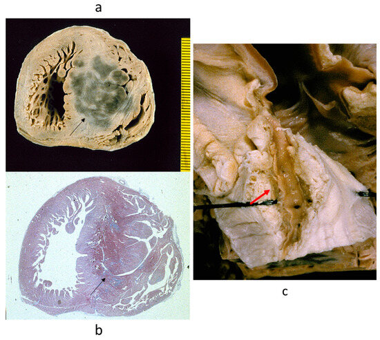 Figure 19. (a,b) Massive infarction of the ventricular septum. Note the huge asymmetric hypertrophy (arrows) and (c) deep, long intramural course of the anterior descending coronary artery (arrow).