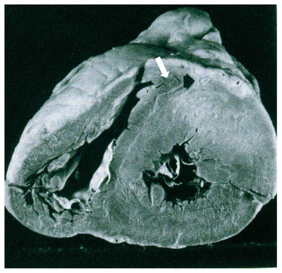 Figure 20. This is the original illustration of the publication of the intramural course of the anterior descending coronary artery (ADCA) as an isolated cause of sudden death. However, it is quite evident that it is a case of hypertrophic cardiomyopathy with anteroseptal asymmetric hypertrophy and intramural course (arrow) of ADCA. Permission was obtained from [27].