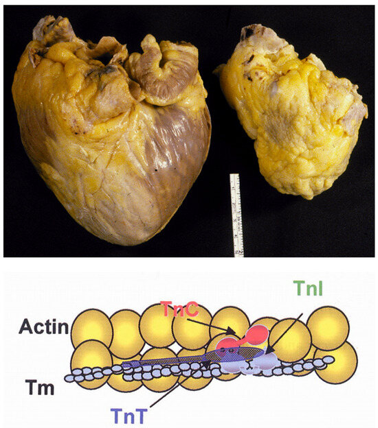 Figure 22. The paradox of a small heart in restrictive cardiomyopathy (on the right) requiring transplantation, compared to the “cor bovinum” of dilated cardiomyopathy (on the left). A genetic mutation of troponin I (low) was found [14]. Tm= tropomyosin; TnC = troponin C; TnI = troponin I; TnT = troponin T.