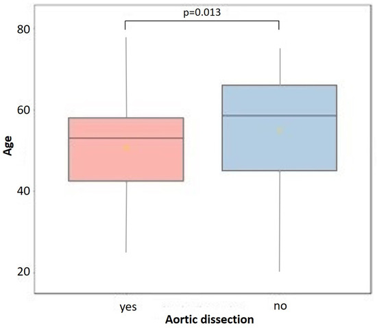 The relationship between nominal variables and the presence or absence of aortic dissection was examined using contingency tables using Fisher’s exact test. Figure 1 presents the results of a comparative analysis of the age of patients in relation to cases of aortic dissection: the mean age was 50.6 (1.7) years old in the subgroup of patients with aortic dissection, and 55.0 (1.7) years old in patients without aortic dissection.