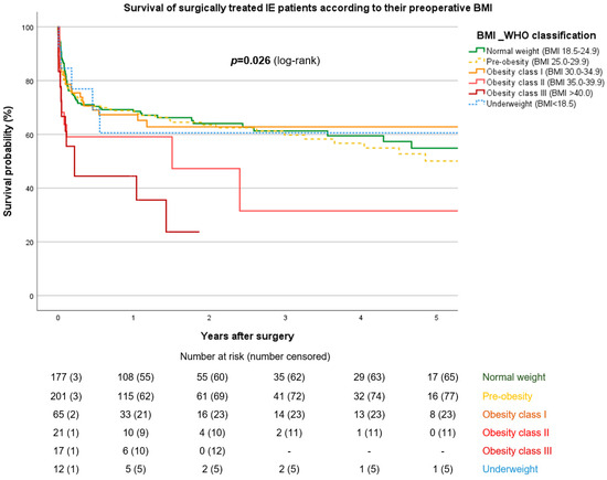 Infective endocarditis (IE) is a life-threatening disease, usually presenting with a severe course and a wide range of complications [1]. Untreated, IE patients usually have a poor prognosis. Even with early and optimal therapy, the in-hospital survival rate is just over 80% [2,3]. Therefore, the identification of factors influencing the clinical course is of immense importance for clinical practice. Along with other clinical parameters, the body mass index (BMI) contributes to the overall risk stratification of a patient [4]. BMI is a simple and widely accepted anthropometric measurement of a patient’s body proportions, nutritional status, and overall physique [5]. Obesity is often associated with a variety of cardiovascular and endocrine comorbidities [6]. On the other hand, underweight patients might exhibit underlying malnutrition, immunosuppression, or sepsis and are susceptible to reduced wound healing and delayed recovery after surgery. Thus, it could be assumed that patients exhibiting extreme BMIs are at increased risk of a worse postoperative course after surgery for IE.