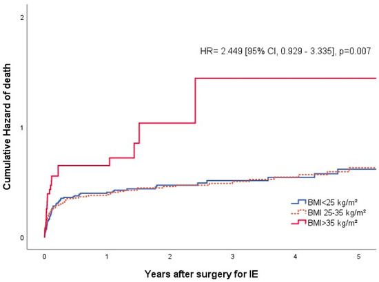 The impact of BMI on the outcomes of surgically treated patients with IE is not yet fully understood, as conflicting results exist in the literature. Harris et al. have found that higher BMI is associated with increased rates of postoperative complications after cardiac surgery, prolonged hospital stays, and higher resource utilization [7]. Conversely, Johnson et al. have shown no significant association between BMI and surgical outcomes, with even better survival after cardiac surgery, reporting a so-called “obesity paradox” [8]