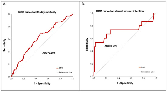 Class II and III obese patients exhibited higher rates of postoperative wound infection, acute kidney injury, and 1-year mortality. The ROC curve showed a good discrimination for BMI in predicting sternal wound infection. Higher wound infection rates in obese patients vs. non-obese patients are evidenced, as reported after cardiac surgery in many studies [18,19]. In agreement with our results, O’Sullivan reported higher rates of AKI after cardiac surgery in obese patients with a BMI ≥ 30 kg/m2 [20].
