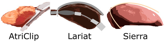 There are two main categories of left atrial appendage closure and occlusion procedures: endocardial and epicardial. External closure of the left atrial appendage neck closure using a loop (LARIAT), band (Sierra), or clip (AtriClip) is the basis of epicardial treatments—see Figure 1 [29,30,31].