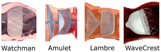 Endocardial occlusion methods are based on the percutaneous introduction of transcatheter devices that prevent embolization of the potential thrombus into the bloodstream [32,33,34,35]. There are also a few devices available in this category: WATCHMAN (the first available), AMULET, WaveCrest, and LAmbre—see Figure 2 [32,33,34,35].