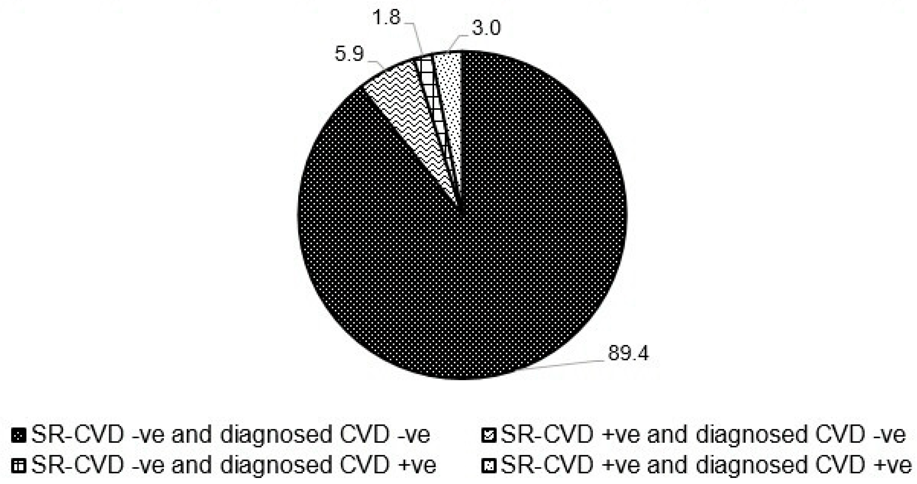 | Total CVD | 597 | 319 | 62.7 (57.1–68.0) | 93.8 (93.2–94.4) | 33.5 (29.7–37.4) | 98.1 (97.7–98.4) |