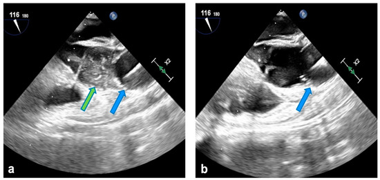 (a) Endo-aortic balloon in ascending aorta (blue arrow); cardioplegia delivery (green arrow). (b) Correct positioning of the endo-balloon in ascending aorta at the end of cardioplegia administration.