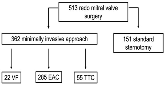During the study period, 513 consecutive redo patients underwent MV surgery at our department (Figure 2). Among the 362 (70.6%) patients who were addressed with a minimally invasive approach via right mini-thoracotomy, 285 (78.7%) met the criteria and were selected for RAP and EAC.