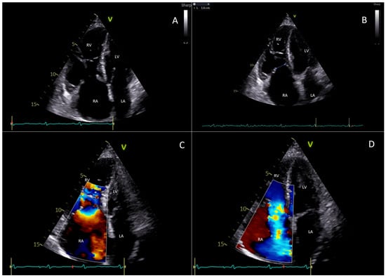 CHD assessment and disease severity evaluation is primarily performed with transthoracic echocardiography (TTE) [16]. A wide variety of echocardiographic findings characterize heart involvement differently in early and advanced disease [16]. The severity of tricuspid valve (TV) dysfunction can range from mild, isolated thickening of a single valve leaflet, without a significant reduction in leaflet mobility, to advanced retraction and immobility of multiple leaflets. The onset of valvular regurgitation and stenosis represents the initial phase of the disease since leaflets are less mobile and do not close in systole, resulting in a frequent central gap, and partially open during diastole, resulting in restricted mobility (Type IIIa in the Carpentier Classification) [16,28,29]. Moreover, their typical concave curvature is reduced, the leaflet dynamic motion is modified during the diastole, and they exhibit a rigid, board-like motion. As the disease progresses, the valve leaflets gradually thicken, with the chordae and papillary muscles also being affected. When conditions become extremely severe, leaflets become rigid, retract, and cease to coapt so that functionally, massive/torrential tricuspid regurgitation unifies the RV and atrium into a single chamber. All these anatomical findings can be easily studied by a comprehensive TTE using parasternal, apical, and subcostal standard views [30]. Severe tricuspid regurgitation is also indicated by a Doppler profile consisting of a triangular shape (sometimes called “dagger-shaped”), due to the rapid decrease in the driving pressure during systole caused by an increase in right atrial pressure [28]. Figure 1 illustrates the typical echocardiographic findings of TV involvement in the setting of CHD.