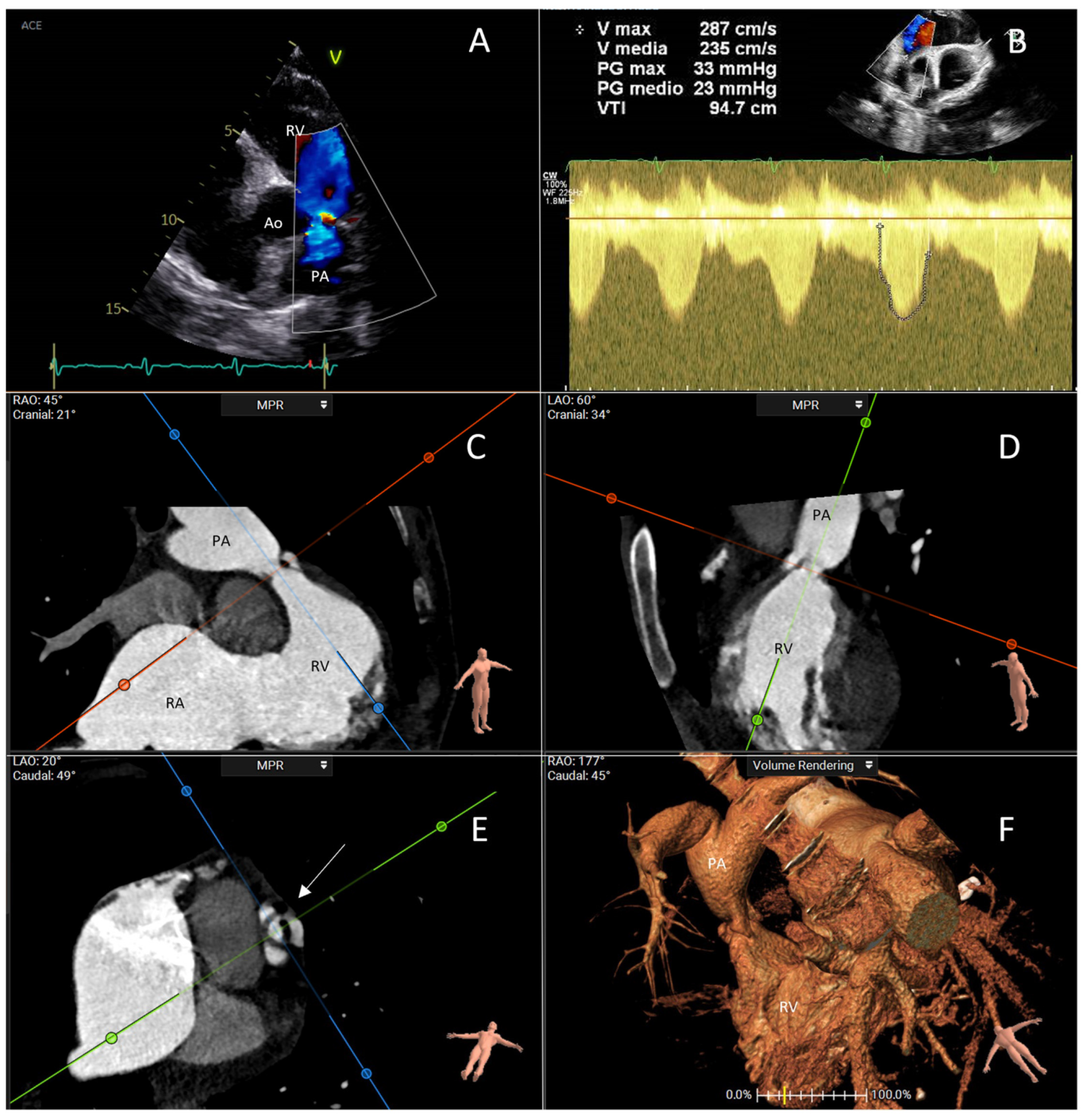 - Cammalleri, V.; Piscione, M.; De Luca, V.M.; Antonelli, G.; Cocco, N.; Nusca, A.; Gaudio, D.; Nobile, E.; Coletti, F.; Bianchi, A.; et al. Carcinoid Pulmonary Valve Stenosis: Multimodality Imaging and Transcatheter Valve Implant with Prestenting Technique. Circ. Cardiovasc. Imaging 2024, 18, e016785. [Google Scholar] [CrossRef] [PubMed]