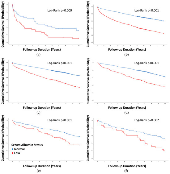 Cumulative survival according to serum albumin status and body mass index category: (a) underweight; (b) normal weight; (c) overweight; (d) class 1 obesity; (e) class 2 obesity; (f) class 3 obesity. BMI = body mass index.