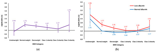 The hazard imposed by low serum albumin status was only manifested in patients presenting at hospitalization with either a normal BMI (AdjHR 1.73, 95% CI 1.50–1.99, p < 0.001), overweight (AdjHR 1.55, 95% CI 1.35–1.79, p < 0.001), or class 1 obesity (AdjHR 1.37, 95% CI 1.12–1.68, p = 0.002)—but not with underweight (AdjHR 0.84, 95% CI 0.35–2.00, p = 0.698), class 2 obesity (AdjHR 1.17, 95% CI 0.77–1.75, p = 0.465), or class 3 obesity (AdjHR 1.70, 95% CI 0.84–3.42, p = 0.137) (Supplemental Tables S9 and S10, and Figure 2). Likewise, a 1 g/dL decrease in serum albumin level independently conferred an increased mortality risk only within the normal weight to class 1 obesity subgroups (Supplemental Figure S5). Upon interaction analysis, hypoalbuminemia demonstrated a weaker association with mortality among patients with abnormal vs. normal BMI, reaching statistical significance in the class 1–2 obesity subgroups (Table 3 and Figure 2).