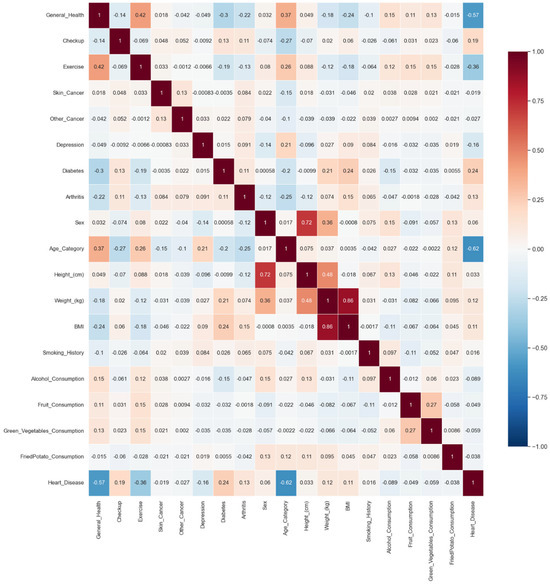 A visualization of the distribution of feature attributes was conducted using heatmaps, which provided an intuitive and visually effective method to illustrate the relationships between variables by showcasing their correlation matrix. The body mass index (BMI), derived from the height (cm) and weight (kg) attributes, was identified as a highly significant feature. Additionally, factors such as diabetes, checkups, arthritis, and weight (kg) were found to be the most influential in predicting the likelihood of cardiovascular disease (CVD).