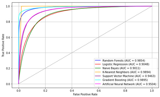Figure 3 displays the Receiver Operating Characteristic (ROC) Curve outcomes of the machine learning models. From this figure, it was observed that the Random Forest, k-Nearest Neighbors (kNN), and Gradient Boosting models exhibited superior performance, as evidenced by their higher AUC-ROC scores compared to other models. These results suggested that these models had strong discriminatory power and were effective in accurately classifying the data.