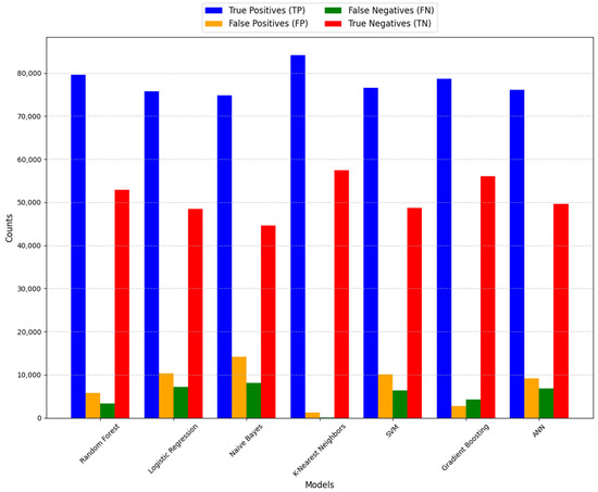 Figure 4 presents the confusion matrix metrics, including true positives (TP), false positives (FP), false negatives (FN), and true negatives (TN), for all classification models.