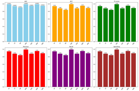 To assess prediction models, six widely used evaluation measures were employed. These included precision, recall, specificity, accuracy (ACC), F1-score, and Area Under the ROC Curve (ROC-AUC). These metrics are frequently used in various applications, such as disease diagnosis, fraud detection, and spam filtering, to evaluate the performance of binary classifiers.
