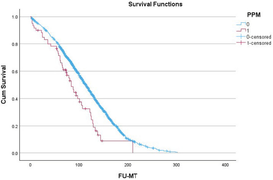 Survival of patients with (red line) and without PPM (blue) implant. FU-MT: follow-up in months; PPM: pacemaker; 0: patients without an implant; and 1: patients with an implant.