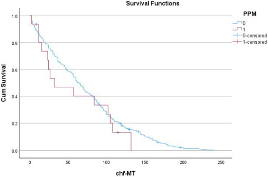 The need for PPM implantation had no significant effect on freedom for long-term CHF (p = 0.359). Chf-MT: freedom of congestive heart failure; PPM: pacemaker; 0: patients without an implant; and 1: patients with an implant.