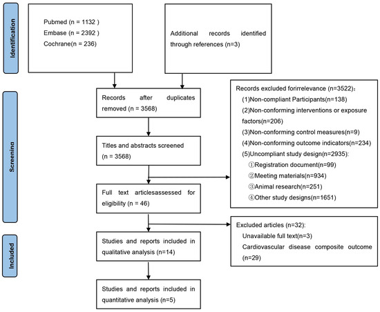 Fourteen studies were included in this review [13,14,22,23,24,25,26,27,28,29,30,31,32,33], five of which were included in the meta-analysis [13,23,26,27,28]. The specific procedure of the literature search was displayed in strict accordance with the PRISMA flow chart, as shown in Figure 1.