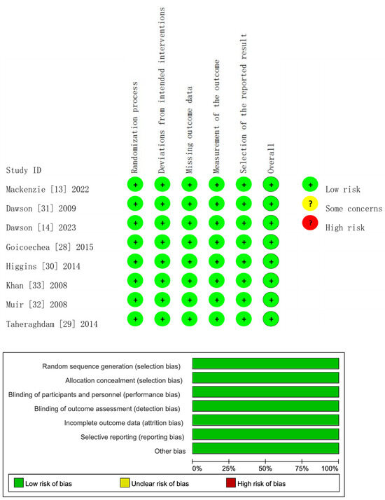 Quality evaluation was carried out on the 14 studies included [13,14,20,21,22,23,24,25,26,27,28,29,30,31] using different tools. To be specific, eight RCTs [13,14,28,29,30,31,32,33] were evaluated for quality using ROB2.0, and it was confirmed that they all had a low risk of bias (Figure 2). The five included cohort studies [23,24,25,26,27] were evaluated for quality using the NOS, and it was found that they all had an NOS score ≥ 7 points, indicating high quality (Table 3).