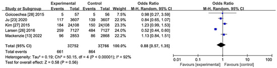 Results regarding primary prevention: occurrence of stroke with forest plot of heterogeneity test results, with Larsen et al.’s study (2016) [26] excluded.