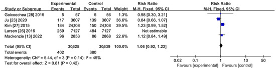 Review Manager 5.4 was used for data analysis. Relative risk (RR) with a corresponding 95% confidence interval (CI) was pooled for binary variables [21]. I2 ≤ 50% suggested no significant heterogeneity among studies, and the data were pooled using the fixed-effects model; I2 > 50% suggested significant heterogeneity among studies, and the random effects model was adopted. The possible sources of heterogeneity were explored by sensitivity analyses using the elimination method. Specifically, each included literature was excluded one by one or a specific group of the literature was excluded, and then the effect size was pooled to check whether the statistical results changed significantly. Funnel plots were created to display the publication bias of outcome indicators involved in ≥10 included studies. Since only five studies were included in the meta-analysis, no publication bias test or funnel plot drawing was carried out.