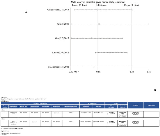 A total of five studies were included in the quantitative synthesis [13,22,26,27,28], involving 75,518 subjects, including 37,752 in the treatment group and 37,766 in the control group. The results of heterogeneity tests showed p = 0.57 and I2 = 92%, suggesting significant heterogeneity across studies, so the random effects model was used for analysis. The effect of XOIs versus blank control/routine treatment on the incidence of stroke was compared using meta-analyses, and no significant association between the use of XOIs and the incidence of stroke was observed (RR: 0.89; 95% CI: 0.59–1.34) (Figure 3). In addition, sensitivity analyses were carried out to explore the possible causes of heterogeneity. Specifically, all included studies were excluded one by one, followed by the pooling of effect sizes. It was found that Larsen et al.’s [26] study resulted in major heterogeneity (p = 0.42, I2 = 45%) but it did not affect the robustness of the results, i.e., the incidence of stroke had no statistically significant difference among patients using XOIs compared with the control group (RR: 1.06; 95% CI: 0.92–1.22) (Figure 4 and Figure 5A). It was confirmed by GRADEpro that both RCTs and cohort studies on primary prevention of stroke had moderate quality evidence (Figure 5B).