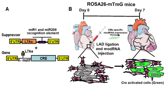 Previously, there was not an mRNA-based system available to deliver any gene in a cell-specific manner in the heart. The mRNA does not differentiate the cells and they are translated by the cell’s translational machinery. There are many cellular processes in the context of the heart after injury where developing cell-specific mRNA therapeutics would be helpful; for example, the use of cell cycle inducers such as cyclins, viral proteins, and growth factors in a non-cell-specific (global) manner increases proliferation in CMs and non-CMs, which might inhibit the cardiac repair process [11,34,44]. To express any gene (modRNA) only in CMs, a CM-specific modRNA system was designed that has two distinct modRNA constructs [11]. The first modRNA construct is a suppressor or repressor modRNA (m1Ψ), which carries L7AE, an archaeal ribosomal protein that regulates the translation of a gene of interest modRNA with a kink-turn motif (k motif), a specific binding site for L7AE [45,46]. Translation of L7AE modRNA suppresses the translation of the gene-of-interest modRNA when the two are cotransfected into the cell. By adding a CMs-specific microRNA (CMSmiR) recognition element to the L7AE gene, we can prevent L7AE translation in CMs that plentifully and mostly exclusively express the miR (“suppress the suppressor” approach), allowing the translation of the gene-of-interest modRNA precisely in CMs (Figure 1).