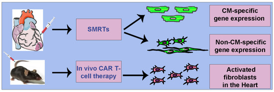 Cell-specific modRNA delivery platforms in the heart. SMRTs platform to target cardiomyocytes or noncardiomyocytes (direct injection in myocardium) and in vivo CAR T-cell therapy to target activated fibroblasts in CVD (intravenous injections).