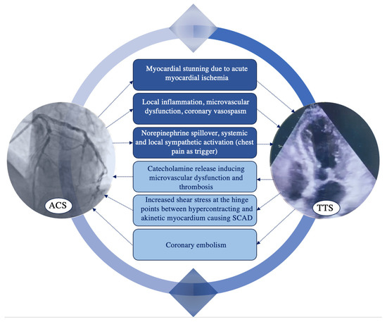 Even though there are more data about the ischemia-driven TTS, primarily secondary to ACS, there is some evidence of ACS secondary to TTS [88]. The bidirectional cause–effect relationship between CAD and TTS is illustrated in Figure 2.