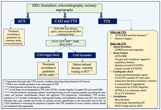 Proposed algorithm for choosing the most appropriate diagnostic methods and therapeutic strategy in patients with Takotsubo and coronary artery disease. ACEi = Angiotensin-converting enzyme inhibitors; ACS = acute coronary syndrome; ARB = Angiotensin II receptor blockers; CABG = coronary artery bypass graft; CAD = coronary artery disease; CMR = cardiac magnetic resonance; ECPELLA = Extracorporeal Membrane Oxygenation–Impella; FFR = Fractional flow reserve; IV = intravenous; IABP = Intra-aortic balloon pump; IVUS = Intravascular ultrasound; LMWH = Low molecular weight heparin; LV = left ventricle; LVAD = Left ventricular assist device; LVOTO = Left ventricular outflow tract obstruction; OCT = Optical coherence tomography; PCSK9i = proprotein convertase subtilisin/kexin type nine inhibitor; PCI = percutaneous coronary intervention; PET = Positron Emission Tomography; SCD = sudden cardiac death; SPECT = Single Photon Emission Computed Tomography; TTS = Takotsubo syndrome; WCD = wearable cardioverter-defibrillator.