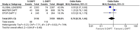 All the analyzed studies (n = 3, with a total of 6275 patients) presented data regarding MACE. A total of 88 patients presented with MACE in the S-DAPT group and 118 in the L-DAPT group. The pooled analysis did not show a significant difference between the two groups (OR: 0.76, 95% CI: 0.39–1.46). High heterogeneity (I2 = 74%) was observed (Figure 2).