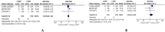 Current guidelines published by the European Society of Cardiology (ESC) suggest 6 and 12 months of DAPT in stable ischemic heart disease and acute coronary syndromes, respectively, with the option of extending the duration in high-ischemic-risk patients and shortening it in high-bleeding-risk patients by up to 1 month [14,15,16]. Nonetheless, these specific time points can be tailored to each patient’s unique characteristics, weighing factors related to their ischemic and bleeding risk. Currently, there is growing evidence from randomized controlled trials (RCTs) and meta-analyses supporting the safety and effectiveness of earlier stoppage of DAPT, exploring a duration of three or even just one month of DAPT [4,17,18]. However, there is a lack of data as to whether these promising preliminary findings can be translated to high-ischemic-risk patients, such as those with complex PCI. The purpose of this systematic review and meta-analysis was to explore the efficacy and safety of 30-day, shortened DAPT (S-DAPT) in patients undergoing complex PCI and to compare it with DAPT lasting for more than three months (L-DAPT).