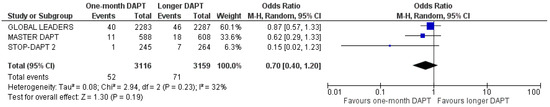 The primary composite = endpoint occurred in 291 patients in the S-DAPT group and in 369 in the L-DAPT. S-DAPT reduced the incidence of NACE, though this result was not statistically significant (OR: 0.77, 95% CI: 0.52–1.14). Heterogeneity was considered as high (I2 = 58%) (Figure 1).