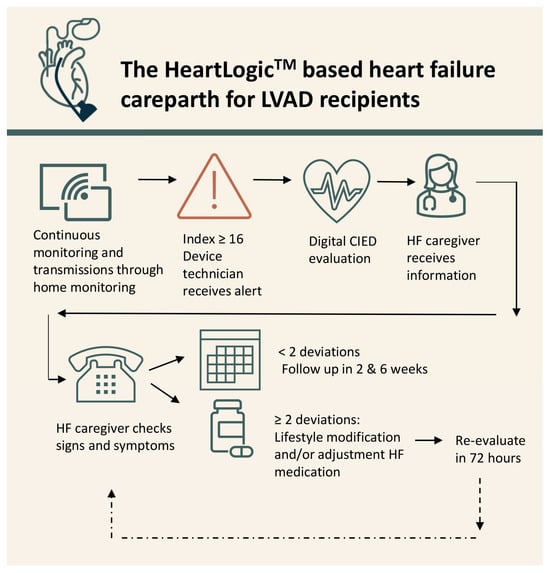 Patients were followed according to previously described the HeartLogicTM-based carepath []. Shortly, patients were continuously monitored via home monitoring. When the threshold of 16 was surpassed, an alert was automatically sent via LATITUDETM (Figure 1). If ICD interrogation did not detect any explanatory-device-related issues, the alert including (amongst others) arrythmia burden and biventricular pacing information was sent to the HF team. A HF nurse contacted the patient within 72 h to evaluate signs and symptoms of worsening HF and LVAD parameters.