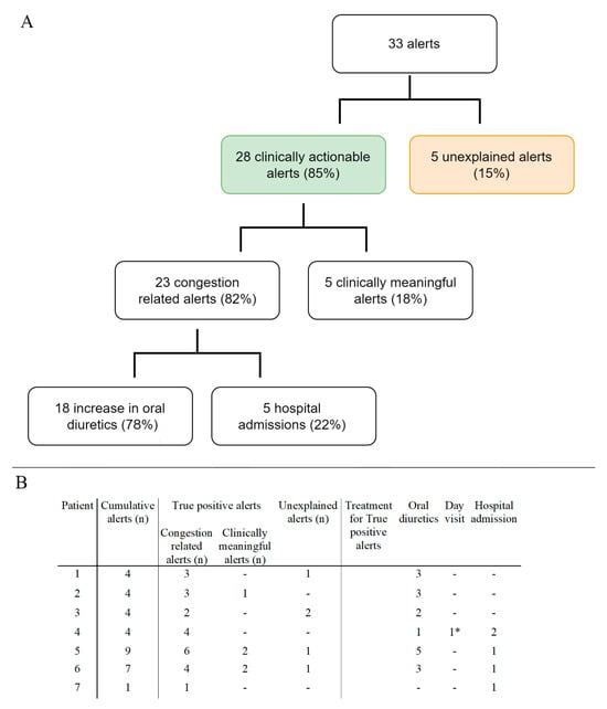 Panel (A). Flowchart of the number and type of alerts observed during the studied period. Panel (B) type and number of alerts per patient and treatment per true positive alert. * One patient required a first aid visit for an electrical cardioversion for atrial arrythmia besides an increase in oral diuretics.