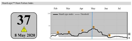A HeartLogicTM report. A: (14 February 2020) The index surpassed the threshold. B: (28 February 2020), HeartLogicTM index remained stable. C: (12 April 2020): the index increased to 23. D: (3 May 2020) the index further increased to 37. E: (7 June 2020) gradual decline of the HeartLogicTM index to 0. The blue line highlights the maximum value of the HeartLogicTM index.