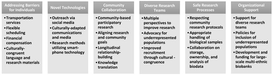 Both barriers to and strategies for the inclusion of underrepresented populations emerged organically through the results of this review, rather than being predetermined. The overarching themes were synthesized to formulate a natural organizational structure. Visual summaries of this review, detailed in Section 3 and Section 5, are found in Figure 1 and Figure 2, respectively.