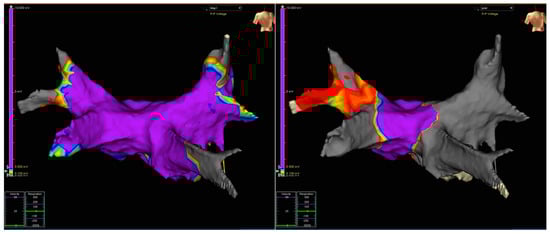 While in the Control group PVI was validated solely with the Achieve-PVP signal mapping, in the Mapping group validation of PVI was done by combined Achieve-PVP signal mapping and a second voltage map using the Achieve catheter and the Ensite system, allowing the comparison of the pre- and post-ablation voltage maps. Low-voltage areas were defined using the conventional cutoff < 0.5 mV, as reported in previous RFA studies [,]. Representative examples are shown in Figure 1 and Figure 2. Figure 1 shows the electroanatomical Achieve/Ensite LA voltage maps performed pre-and post-CBA in the Mapping group.