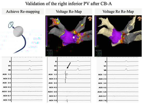 - Yokoyama, K.; Tokuda, M.; Matsuo, S.; Isogai, R.; Tokutake, K.; Kato, M.; Narui, R.; Tanigawa, S.; Yamashita, S.; Inada, K.; et al. Pulmonary vein re-mapping after cryoballoon ablation for atrial fibrillation. Europace 2018, 20, 943–948. [Google Scholar] [CrossRef] [PubMed]
