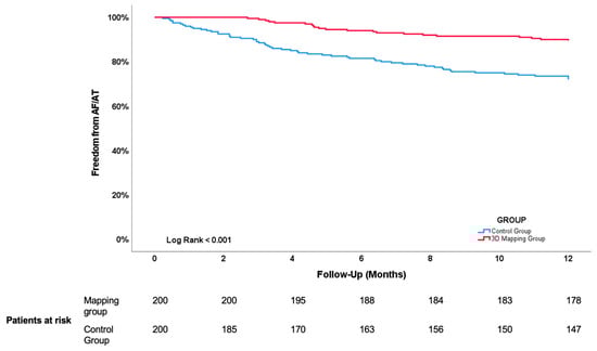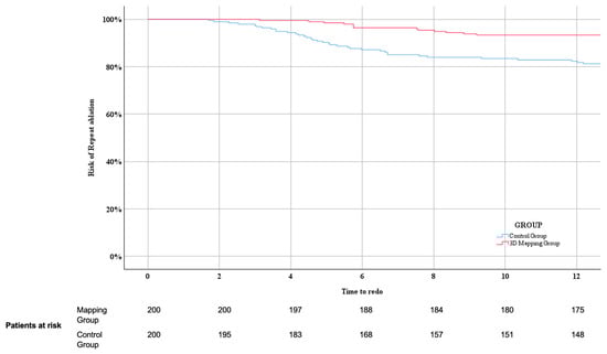 Primary endpoint, defined as freedom of documented atrial arrhythmia at 1 year, was reached in 323 out of the 400 (80.8%) patients. As illustrated in Figure 3, the Kaplan–Meier estimate of clinical success was higher in the Mapping group: 179 (89.5%) remained free of AF versus 144 (72%) in the Control group (p < 0.001). Recurrent arrhythmia during first year of follow-up consisted of AF in 69 patients (18 in the Mapping group versus 51 in the Control group) and AT in 8 patients (3 in the Mapping group versus 5 in the Control group) (p = 0.150). Out of the 77 patients who suffered a recurrence within the first year, 49 (63.6%) patients underwent a repeat ablation: 13 (61.9%) in the Mapping group and 36 (64.3%) in the Control group (p = 0.850). The Kaplan–Meier estimate of undergoing a repeat ablation in patients with a recurrence within the first year of follow-up was significantly lower in the Mapping group (Log Rank 0.000), as shown in Figure 4.