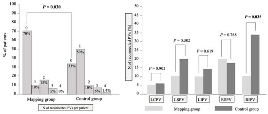 The overall number of patients with PV reconnections was less in the Mapping group (6 out of 20 patients [30.0%] vs. 47 out of 70 patients [67.1%] in the Control group, p = 0.030) (Figure 5, left panel). The PV reconnection pattern per patient differed between groups (p = 0.018) with more patients with persistent complete PVI in the Mapping group (14 out 20 patients [70%] vs. 23 out of 70 (32.9%) in the Control group). On an individual PV level, less PV reconnections of the right inferior PVs were seen in the Mapping group (2 out of 20 patients [10.0%] vs. 24 out of 70 patients [34.3%], p = 0.035). There was no significant difference in reconnection rate of the other PVs (Figure 5, right panel).