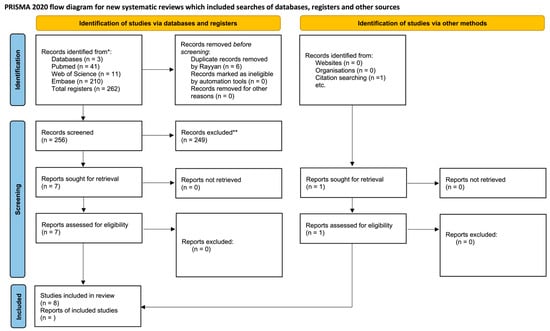 The initial database search generated 226 records, with 41, 11, and 210 found in PubMed, Web of Science, and Embase, respectively. In the duplicate article screening step, 6 articles were excluded, with a total of 256 retained for the analysis. Next, analysis by title and abstract resulted in the inclusion of seven potential articles and the exclusion of two hundred and forty nine. Through a manual search in the reference list, one more article was selected, totaling eight. Thus, eight articles were considered eligible and subjected to qualitative analyses (Figure 1).