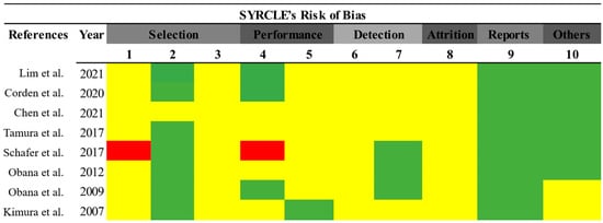 To evaluate the risk of bias, all eight included articles were analyzed. As shown in Figure 2, most articles did not clearly address the criteria for selection bias (items 1–3), performance (item 5), detection (items 6 and 7), and attrition (item 8). Only one of the selected articles presented a risk of bias. Finally, 75% of the selected papers did not report information regarding a possible conflict of interest.