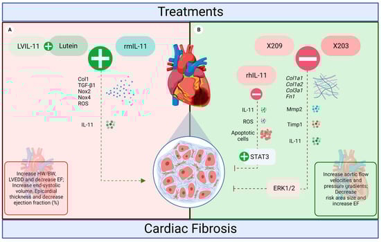 The influence of IL-11 treatments on the heart of rodents. (A) LVIL-11 + lutein and rmIL-11 induced a pro-fibrotic action in the heart (red, worst prognosis). Both treatments potentiated the effects of IL-11, increasing the levels of ROS, Col1, TGF-β1, NOX2, and NOX4, which resulted in increased fibrosis and impaired cardiac function. (B) anti-IL-11 antibodies X203 and X209, and rhIL-11 inhibited cardiac fibrosis (green, beneficial effects). For the inhibitors, the effects were a reduction in IL-11 expression levels and fibrosis associated with the protection of cardiac function. Both antibodies also reduced Col1a1, Col1a2, Col3a1, Fn1, Mmp2, Timp1, and ERK signaling. While rhIL-11 reduced cardiomyocyte apoptosis, ROS increased STAT3 (created with BioRender.com accessed on 2 September 2022).