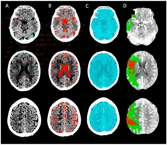 Baseline NCCT images were post-processed using an automated segmentation algorithm (https://github.com/WCHN/CTseg, accessed on 4 July 2021). This algorithm performed the spatial normalization of the CT images and automatically segmented the CSF volume after skull stripping of the image using a Bayesian approach []. ICV was segmented as the complete volume within the skull on baseline NCCT. CSF segmentations were visually checked by an expert neuroradiologist (>15 years of experience) (Figure 2). We determined the ICV and CSF volumes by multiplying the total number of voxels in the segmented intracranial area and CSF with the size of the image voxels, respectively. We calculated TBV by subtracting the CSF volume from ICV. The adjusted CTP-estimated core volumes as a proportion of ICV and TBV were defined as ICVcore and TBVcore and reported as percentages.