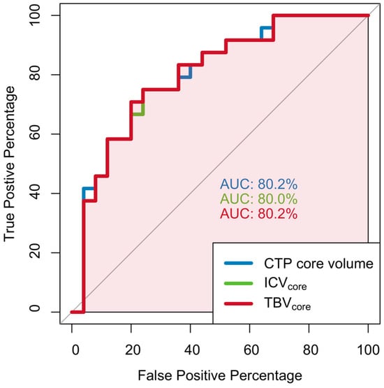 CTP-estimated core volume (cOR per IQR 0.49 [95%CI 0.23–0.70], p < 0.001), TBV (OR per IQR 1.10 [95%CI 1.03–1.20]), ICVcore (cOR per IQR 0.45 [95%CI 0.28–0.65]) and TBVcore (cOR per IQR 0.43 [95%CI 0.26–0.63], p < 0.001) were associated with functional independence at 90 days in univariable analysis. The associations between the CTP-estimated ischemic core volume, ICVcore, and TBVcore and functional independence at 90 days are shown in Figure 3. After adjusting for potential confounders, these associations persisted for the CTP-estimated core volume (acOR per IQR 0.34 [95%CI 0.16–0.70]), ICVcore (acOR per IQR 0.36 [95%CI 0.19–0.65], and TBVcore (acOR per IQR 0.35 [95%CI 0.17–0.63], p = 0.002). Details of the multivariable regression analyses for the functional independence of the CTP-estimated core volume, ICVcore, and TBVcore are provided in Supplementary Table S2 of the Supplemental Materials. ROC analysis showed an AUC of 0.80 for the prediction of functional independence at 90 days for the CTP-estimated core volume, ICVcore, and TBVcore. The results of the ROC analysis are shown in Figure 4.