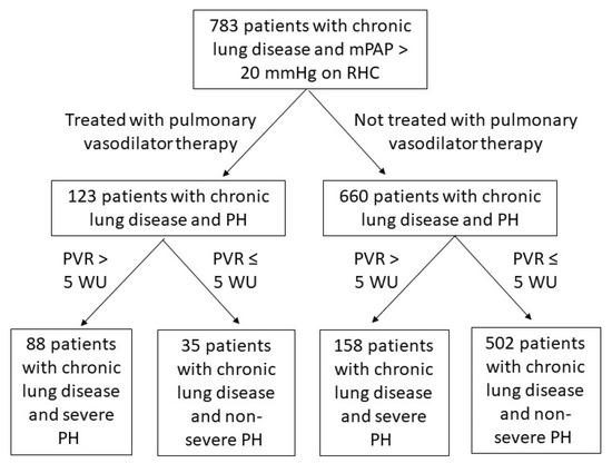 Patient cohort flowsheet. Inclusion and exclusion of patients with chronic lung disease and pulmonary hypertension: Chronic lung disease was defined as either COPD, IPF, another fibrotic ILD, non-fibrotic ILD, sarcoidosis, or CPFE. Pulmonary hypertension was defined as a mean pulmonary artery pressure of >20 mmHg upon right heart catheterization. Severe pulmonary hypertension was defined as a PVR of >5 WU. A total of 783 patients with chronic lung disease and pulmonary hypertension were included in the study. COPD: chronic obstructive pulmonary disease. CPFE: combined pulmonary fibrosis and emphysema. ILD: interstitial lung disease. IPF: idiopathic pulmonary fibrosis.